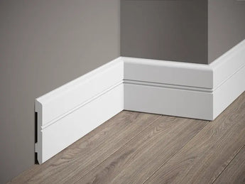 Die MD354 Sockelleiste ist ein interessantes Accessoire für den Innenbereich, das einem Raum eine unkonventionelle Ausstrahlung verleiht. Sie wurde aus hochwertigem PolyForce-Material gefertigt, das sich durch außergewöhnliche Haltbarkeit sowie Wasser- und Sonnenlichtbeständigkeit auszeichnet. Dadurch kann die MD354 bedenkenlos in feuchten Räumen, die intensiver UV-Strahlung ausgesetzt sind, installiert werden. Unter dem Einfluss dieser Faktoren vergilbt, quillt oder reißt die Leiste nicht und behält ihr perfektes Aussehen sowie ihre schneeweiße Farbe bei. Die innovative ScratchShield-Technologie härtet die Oberfläche maximal, wodurch zusätzlicher Schutz gegen Kratzer oder Stöße gewährleistet wird. Die Sockelleiste ist mit einer glättenden Grundierung beschichtet, die das Streichen erleichtert.