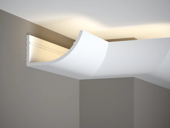 Die Lichtleiste MD362 ist ein gebogenes Profil mit einem unverwechselbaren Design. Ihre größere Größe eignet sich perfekt für große Räume und wird zur Hauptdekoration des Innenraums. MD362 ist mit LED-Beleuchtung abgestimmt. Dank der LightGuard®-Technologie ist die gesamte Oberfläche des Streifens vollkommen gleichmäßig und das LED-Licht streut sanft um den Streifen herum. Der Lichtstreifen wurde mit einer Beschichtung behandelt, die die Struktur glättet und sie für die Lackierung mit einem wasserbasierten Präparat vorbereitet. Eine spezielle Grundierung sorgt dafür, dass die Farbe leichter in das Material einzieht und garantiert eine langlebige Lackierung. Der PolyForce-Kunststoff, aus dem die Leiste besteht, sorgt für vollständige Wasserbeständigkeit und Schutz vor Sonnenlicht.