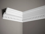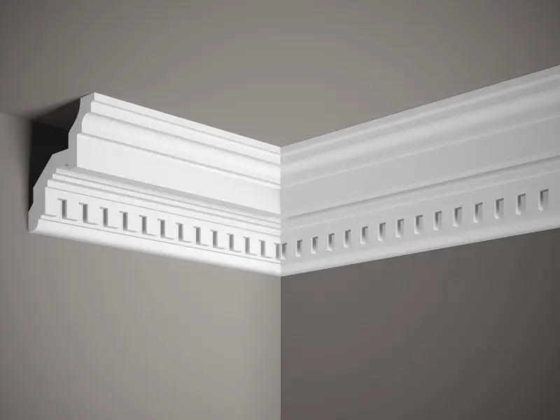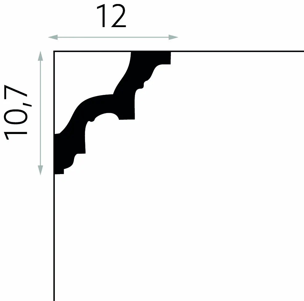 Die Deckensockelleiste MDA046 ist ein dekoratives Profil mit vergrößerten Abmessungen. Die Sockelleiste hat ausdrucksstarke Ornamente und eine unregelmäßige Form, die den Blick auf sich zieht. Sie ist ein perfektes dekoratives Element für mutige Benutzer und unkonventionelle Innenräume im eklektischen Stil. Die vergrößerten Abmessungen von MDA046 wirken sich nicht negativ auf den Installationsprozess aus. Dank des leichten ProFoam-Materials ist das Profil extrem einfach und schnell zu installieren. Die richtige Menge Klebstoff, die auf die Kanten aufgetragen wird, die mit der Ebene in Kontakt kommen, reicht für eine stabile und dauerhafte Befestigung aus. Das PolyForce-Material macht MDA046 wasser- und sonnenlichtbeständig, was die Installation in rauen Räumen ermöglicht, die Wasser und starker UV-Strahlung ausgesetzt sind. Die Deckenleiste ist mit Grundierungsfarbe beschichtet, die die Oberfläche schützt und das Streichen mit der Farbe Ihrer Wahl erleichtert.