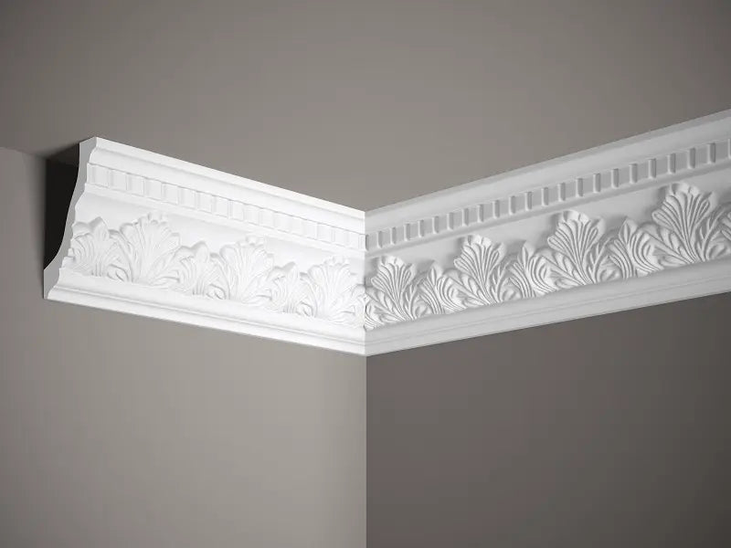 Das florale Design der MDA098 Stuckleiste ist ein echter Blickfang. Die detaillierten Blätter und Ornamente fügen sich harmonisch zusammen und schaffen ein ansprechendes Muster, das Ihre Decke in ein Kunstwerk verwandelt. Jedes Detail ist sorgfältig ausgearbeitet, um ein Gefühl von Opulenz und Luxus zu vermitteln, das den Raum sofort aufwertet.