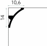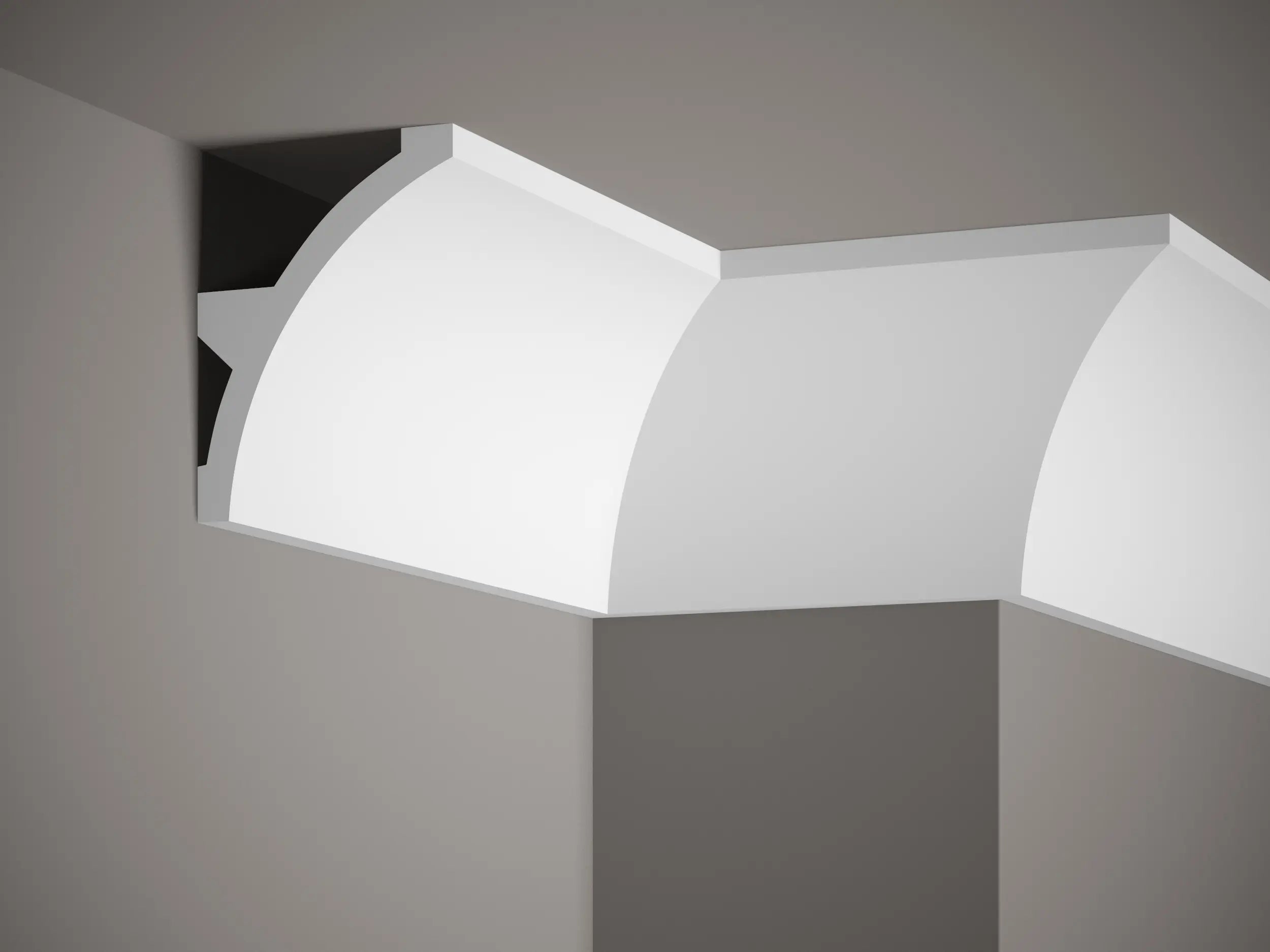 Die Deckenleuchte MDB101 ist ein minimalistisches Profil mit sanft abgerundeter Form. Sie besteht aus wasser- und UV-beständigem ProFoam-Material. Sie eignet sich perfekt für die Installation in feuchten Vorräumen oder bei ständigem Kontakt mit Dampf in der Küche. Dank ihrer UV-Beständigkeit vergilbt sie nicht unter dem Einfluss intensiver Sonneneinstrahlung. Die Deckenleiste ist leicht, was den Installationsprozess erheblich erleichtert und die Stabilität der Befestigung mit der Klebefläche garantiert. MDB101 ist ein bis ins kleinste Detail durchdachtes Design. Sie verfügt über einen speziellen Raum, der sich zum Abdecken von Kabeln sowie für LED-Beleuchtungsinstallationen als nützlich erweisen wird. Die Leiste wurde mit Grundierungsfarbe beschichtet, die die Struktur glättet und die Oberfläche für die Beschichtung mit jeder beliebigen Farbe vorbereitet.