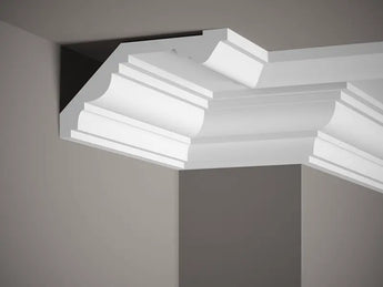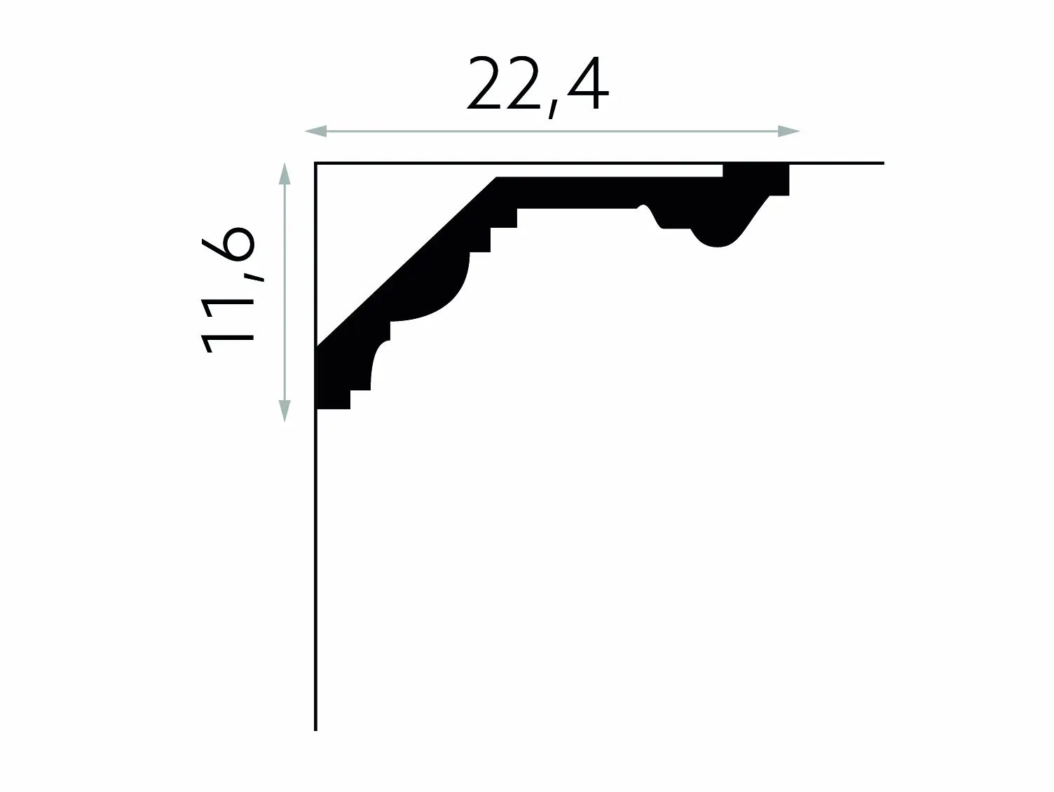 Die Deckenleiste MDB121 ist ein dekoratives Zierprofil. Trotz ihrer Abmessungen ist sie extrem leicht und daher äußerst einfach zu installieren. Das geringe Gewicht des Produkts ist auf die Verwendung des technologisch fortschrittlichen ProFoam-Materials bei seiner Herstellung zurückzuführen. Mit einer Tiefe von 22,4 cm und einer Breite von 11,6 cm wird die Sockelleiste Installationsmängel an der Wand-Decken-Verbindungslinie perfekt abdecken. Sie kann auch verwendet werden, um eine alte Deckenleiste abzudecken, ohne diese vorher entfernen zu müssen. MDB121 ist feuchtigkeitsbeständig. Wasserdampf verformt seine Form nicht, was es ideal für Räume macht, die ständigem Kontakt mit Wasser ausgesetzt sind. Es hat auch eine hohe Beständigkeit gegen UV-Strahlung. Sonnenlicht beeinflusst seine Farbe nicht, sodass es auch über viele Jahre hinweg sein perfektes Aussehen behält.