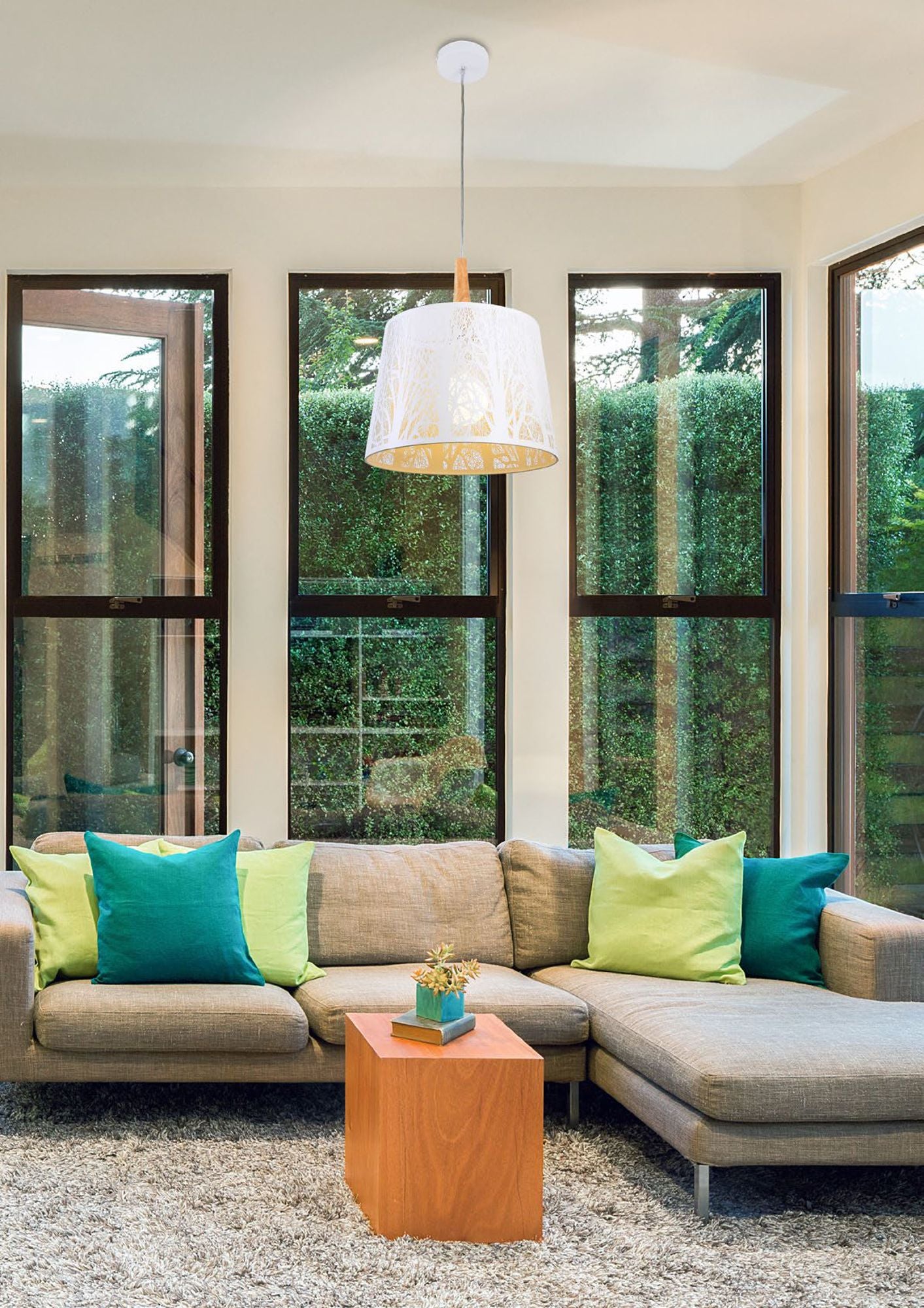 Metallbeschläge in Weiß. Lampenschirm der Leuchte: Metall mit einem Schablonenmuster für einen Effekt von Sonnenlicht auf den Baumkronen. Farbe des Lampenschirms: Weiß. Dekoratives Element aus Buche. Verstellbare Seillänge.