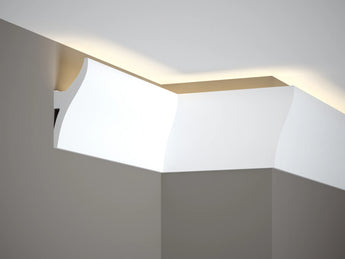 Die Lichtleiste QL010 ist ein auffälliges Interieur-Accessoire. Das Profil ähnelt im Querschnitt einer kleinen Welle, die den modernen Charakter des Interieurs perfekt hervorhebt. Die Leiste verfügt über die patentierte LightGuard®-Technologie, dank der die LEDs effektiv hinter dem Material verborgen sind und nicht durch dieses hindurchragen. Diese Behandlung garantiert eine schöne Lichtstreuung im Raum und einen hervorragenden visuellen Effekt. Die QL010 besteht aus PolyForce, das gegen Verformung beständig ist. Dieses Material ist wasserdicht, sodass die Leiste in einem Raum mit erhöhter Luftfeuchtigkeit installiert werden kann. Ein weiterer Vorteil ist die UV-Beständigkeit. Bei Kontakt mit intensiver Sonneneinstrahlung verfärbt oder vergilbt die Oberfläche nicht und behält die ursprüngliche Farbe. Eine spezielle Grundierung schützt die Oberfläche der Lichtleiste und bereitet sie auf das Bemalen mit Farbe auf Wasserbasis vor.