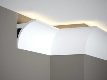 Der Lichtstreifen QL011 ist ein äußerst stilvolles Profil mit einer glatten und minimalistischen Form. Der Streifen wurde im Hinblick auf LED-Beleuchtung entworfen. Er verfügt über eine patentierte LightGuard®-Technologie, die das Durchstrahlen von LEDs durch die Oberfläche blockiert. Dies ermöglicht den Effekt einer sanften Lichtaura, die den Raum umhüllt. QL011 wurde mit einer Grundierung beschichtet, die die Textur glättet und das Streichen erleichtert. Dank dieser Grundierung können Sie den Farbton ganz einfach Ihren Bedürfnissen entsprechend anpassen. Der Lichtstreifen wurde aus PolyForce-Polymer hergestellt. Er zeichnet sich durch Kratzfestigkeit, Sonnenlicht- und Wasserbeständigkeit aus. Der Streifen quillt unter dem Einfluss von Feuchtigkeit nicht auf und vergilbt nicht bei intensiver Sonneneinstrahlung.